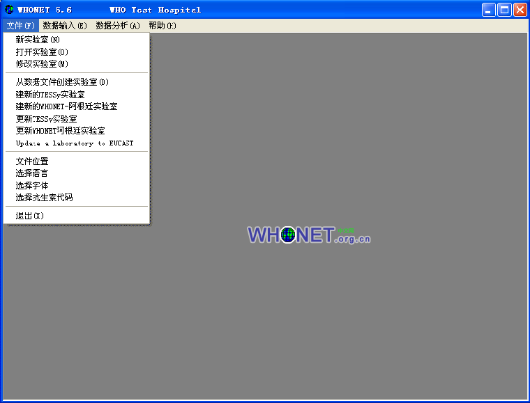 文件菜单:可创建新的实验室、打开另一个实验室或修改当前实验室,可以从数据文件创建实验室,可以选择语言、选择字体、选择抗生素代码等,还可以选择退出命令退出WHONET程序。